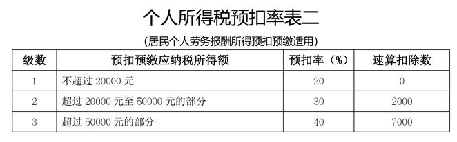 勞務報酬所得適用20%至40%的超額累進預扣率(見《個人所得稅預扣率表二》)。